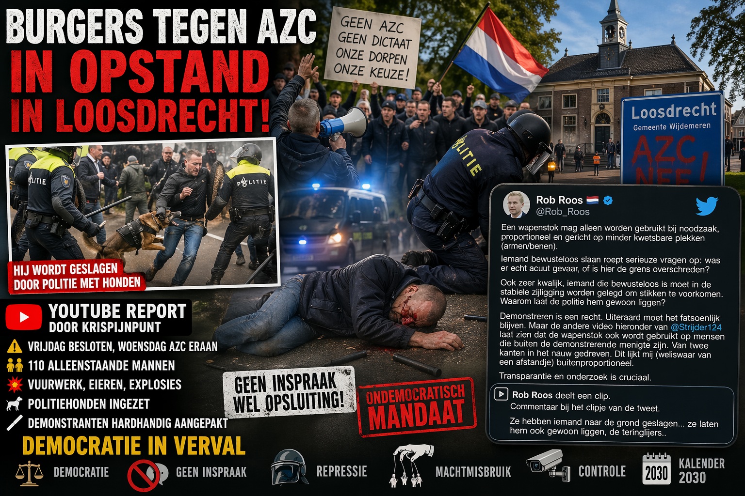 De spanning liep in Loosdrecht volledig uit de hand toen burgers zich verzamelden bij het voormalige gemeentehuis uit protest tegen de plotselinge komst van een AZC voor 110 asielzoekers. Wat begon als een demonstratie tegen een besluit dat volgens inwoners zonder inspraak werd doorgedrukt, eindigde in een chaotische confrontatie met politiehonden, ME-busjes, vuurwerk, eieren en…