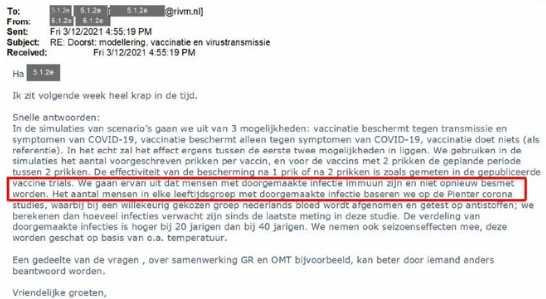 In de mail wordt expliciet gesproken over drie scenario’s: vaccinatie die zowel transmissie als symptomen vermindert, vaccinatie die alleen symptomen vermindert, of vaccinatie zonder effect op transmissie. Tegelijkertijd wordt vastgesteld dat bescherming tegen transmissie niet nul is en dat het verschil tussen één of twee prikken daarin beperkt lijkt op basis van de toen beschikbare data.
