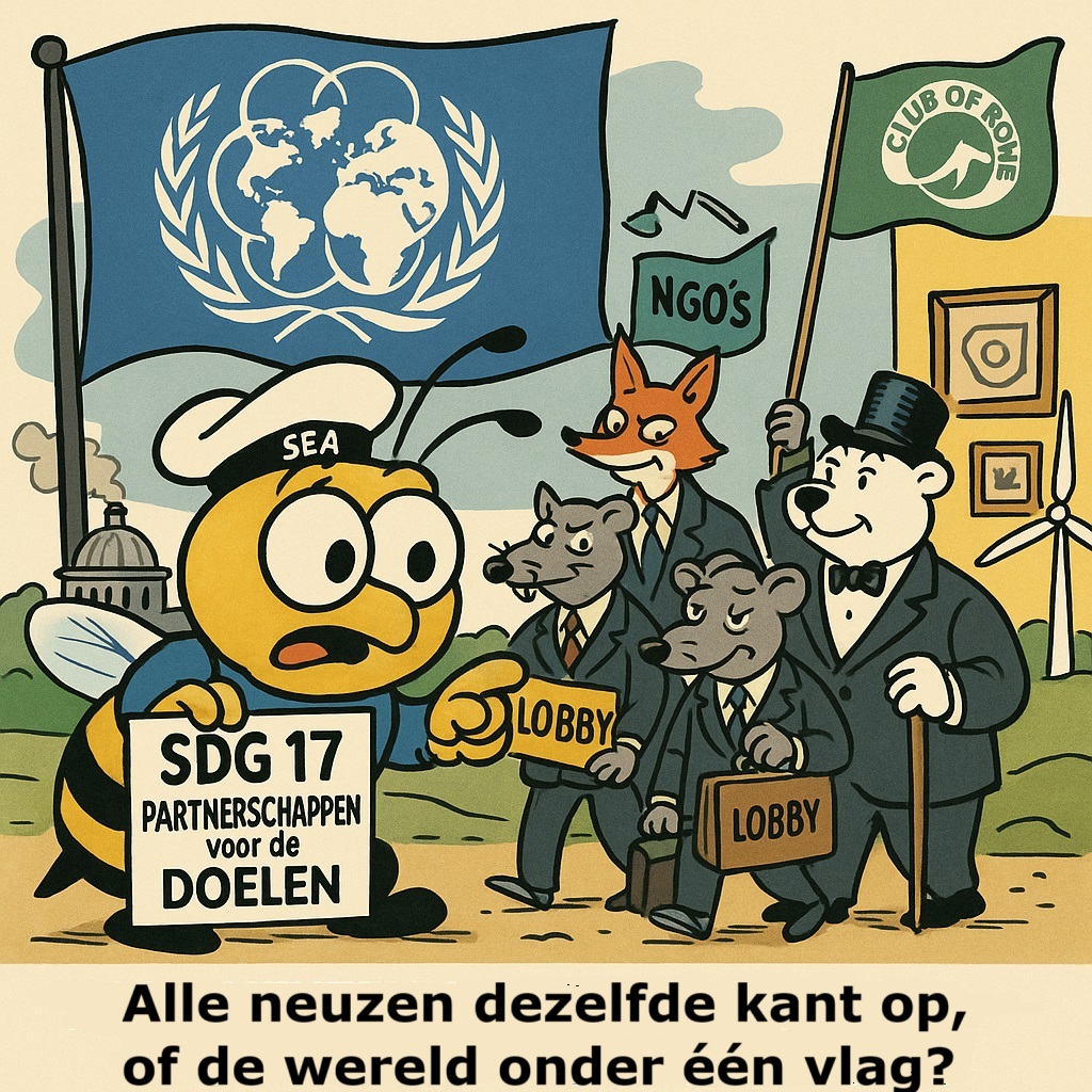 Het klinkt bijna gezellig: “partnerschappen voor de doelen.” Alsof de wereld een scoutingkamp is waar iedereen hand in hand een kampvuurkring vormt. Maar wie wat dieper kijkt, ziet dat achter de warme woorden van SDG 17 een koude machinerie schuilgaat. Geen knus kampvuur, maar een strak georganiseerde netwerkstaat, waarin multinationals, NGO’s en politici samenkomen in een dans die meer wegheeft van een coup dan van samenwerking.